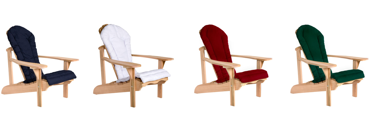 Fitted Adirondack chair cushions available in 5 vibrant colors: Blue, Green, Red, Royal White and White